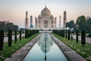 The Taj Mahal in Agra, India, built in 1653 by Emperor Shah Jahan for his wife, Mumtaz Mahal, is a white marble masterpiece and a timeless symbol of love, blending Islamic, Persian, Turkish, and Indian styles.